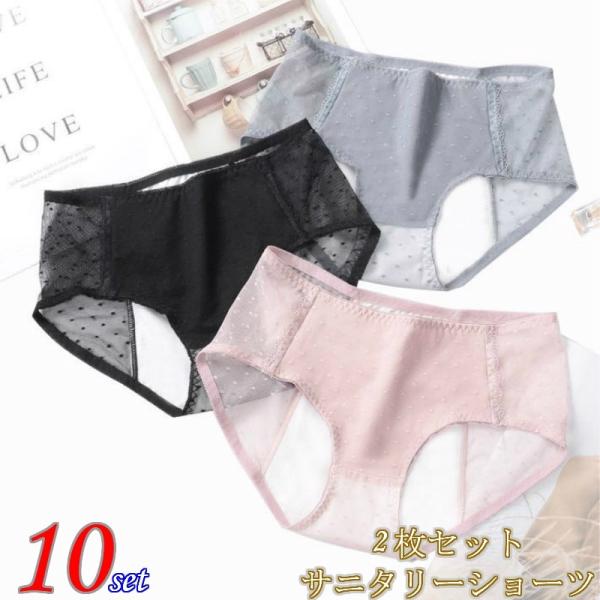 ショーツ サニタリーショーツ 2枚組 綿混 生理用 シンプル レース 生理用パンツ リブ ひびきにくい 後ろもれ防止 メール便 送料無料