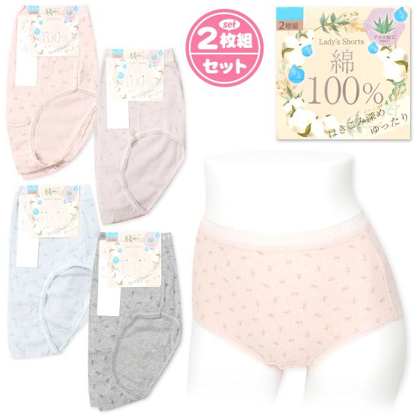 送料無料 2枚組セット 婦人 レディース ショーツ リブ 本体綿100% アロエ加工 保湿 丈長 ゆったりはきこみ深め 小花柄 レース 下着 yg-2201 メール便対応