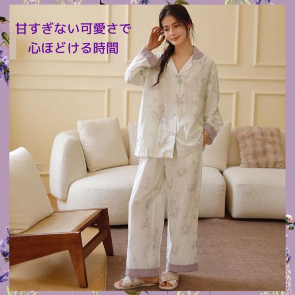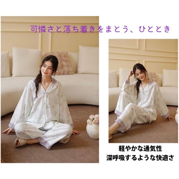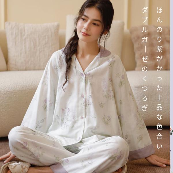 WダブルガーゼW【日本製】2025新作 上品パープル小花柄 長袖 長ズボン パジャマ ルームウェア