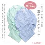パジャマ レディース 婦人 綿100% ダブルガーゼ 長袖 春 秋 前開き ボタン ストライプ 家族 親子 おそろい お客様 入院 母の日 敬老の日 婦人 二重ガーゼ