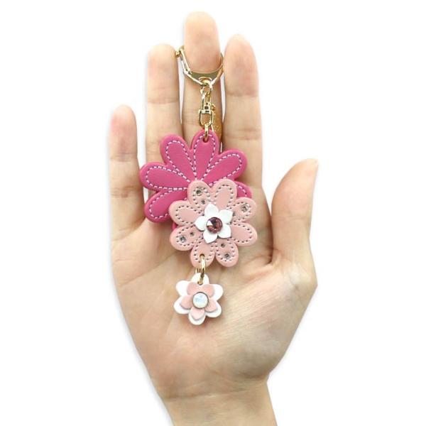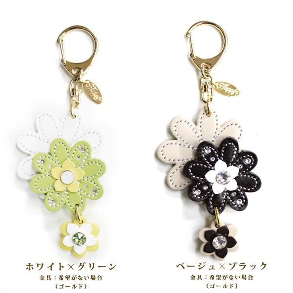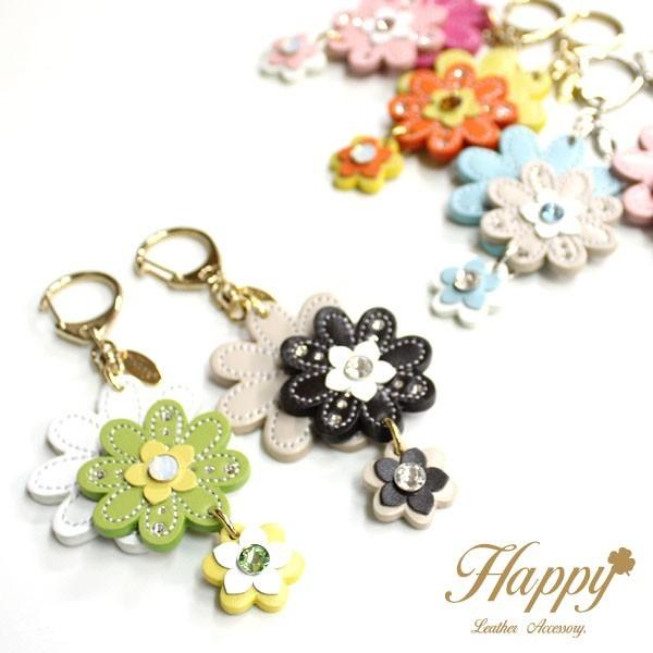 Happy トリプル フラワー お花 レザー キーホルダー 日本製 本革 スワロフスキー かわいい おしゃれ キーリング 革 レディース バッグチャーム プレゼント 女性