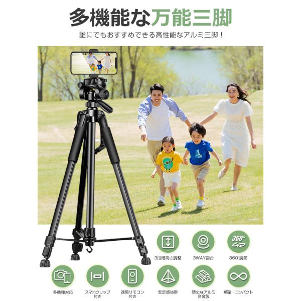 収納袋付き 三脚 スマホスタンド ビデオカメラ スマホ三脚 3WAY雲台 デジタル一眼レフ 最高170cm 3段階伸縮 360度回転 リモコン付 折り畳み式 自撮り棒