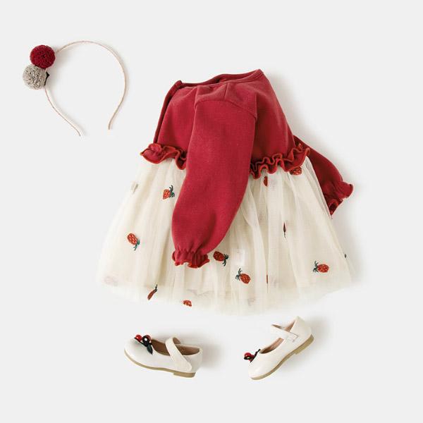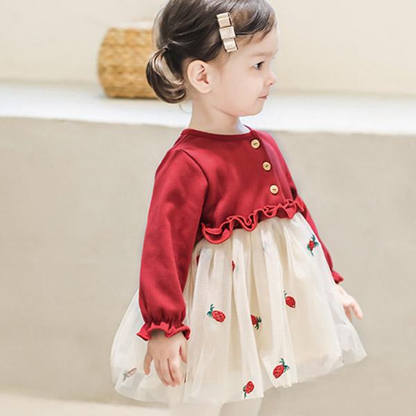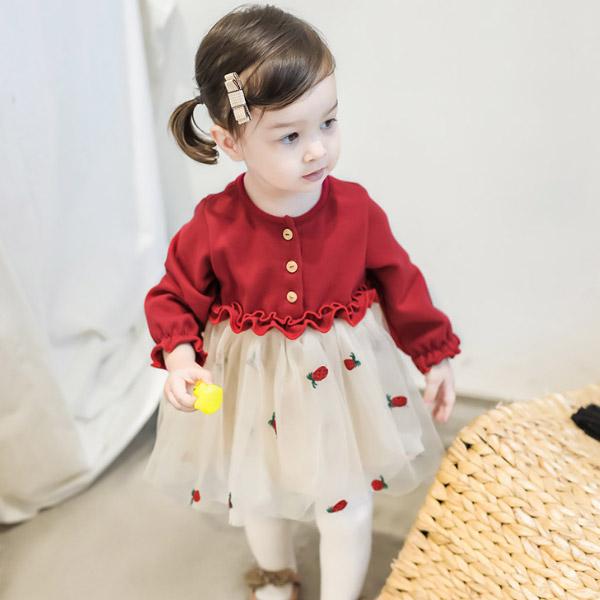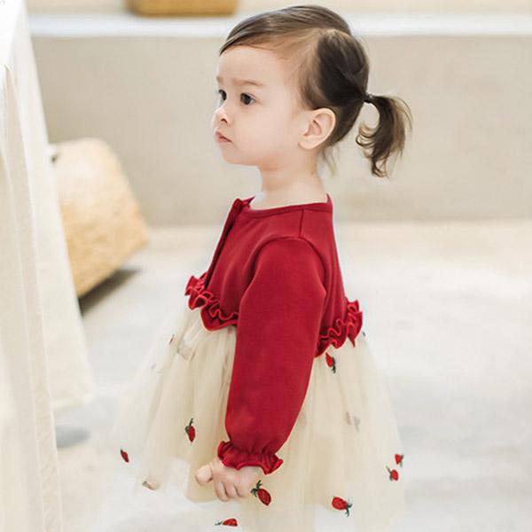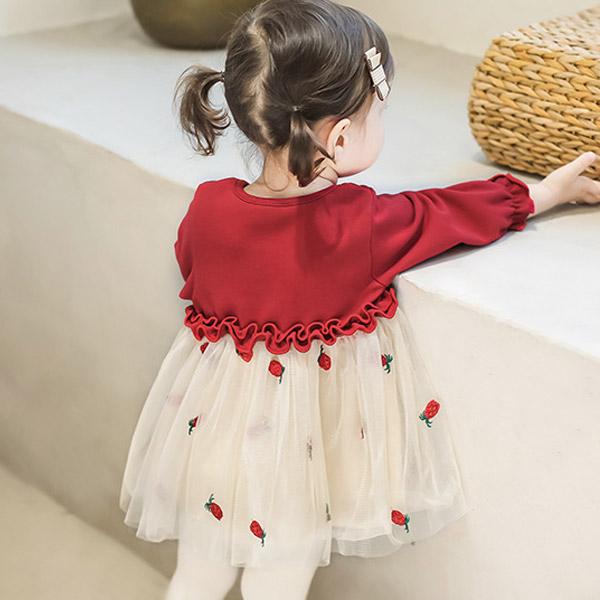 ワンピース 女の子 チュール ドレス ベビードレス ベビー キッズ 長袖 赤 レッド フォーマル いちご 子供 赤ちゃん ベビー服 衣装 結婚式 1歳 誕生日