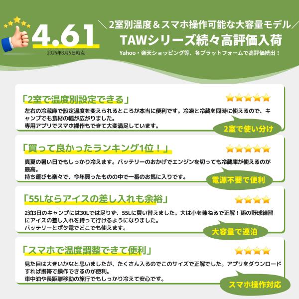 EENOUR 車載冷蔵庫 ポータブル冷蔵庫 55L 2室 バッテリー内蔵可能 2ドア 大容量 ブルートゥース 防災 アウトドア イーノウ TAW55