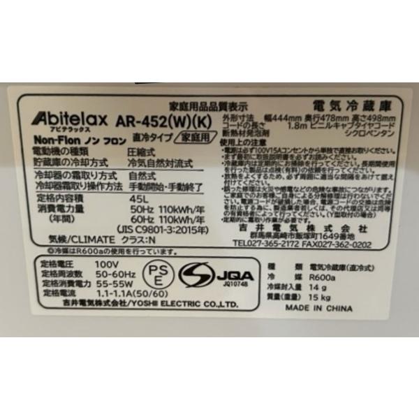 中古美品 abitelax 冷蔵庫 AR-452(W)(K) (45L・幅44.4cm・右開き・1ドア)
