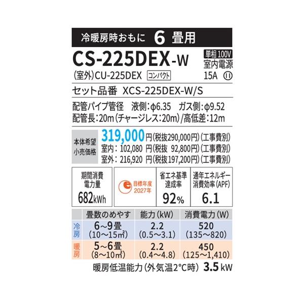 CS-225DEX-W パナソニック エアコン 6畳 EXシリーズ お掃除ロボット 自動排出方式 2025年度モデル 在庫あり 法人様限定販売
