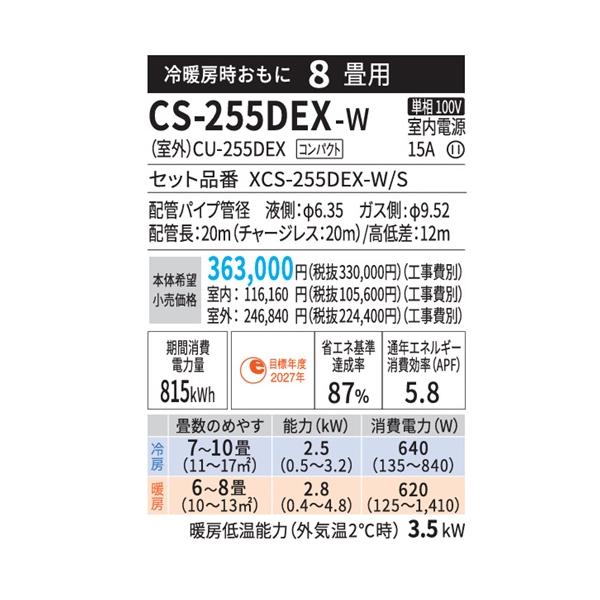 CS-255DEX-W パナソニック エアコン 8畳 EXシリーズ お掃除ロボット 自動排出方式 2025年度モデル 在庫あり 法人様限定販売