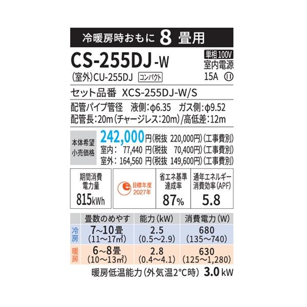CS-255DJ-W パナソニック エアコン 8畳 Jシリーズ ナノイーX 搭載 スタンダードモデル 2025年度モデル 在庫あり 法人様限定販売