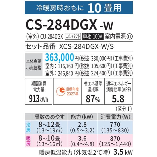 CS-284DGX-W パナソニック エアコン 10畳 GXシリーズ お掃除ロボット ダストボックス方式 2024年度モデル 在庫あり 法人様限定販売