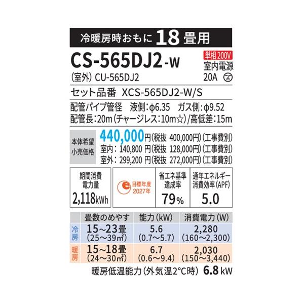 CS-565DJ2-W パナソニック エアコン 18畳 Jシリーズ ナノイーX 搭載 スタンダードモデル 2025年度モデル 在庫あり 法人様限定販売