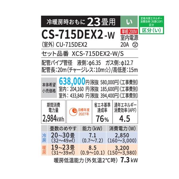 CS-715DEX2-W パナソニック エアコン 23畳 EXシリーズ お掃除ロボット 自動排出方式 2025年度モデル 在庫あり 法人様限定販売