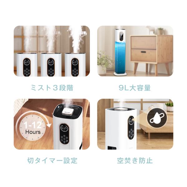 加湿器 タワー型 大容量 9L 4重除菌 UV除菌 マイナスイオン機能 ヒーター機能 高温除菌 自動湿度調節 6段階加湿量調節 タイマー付き 空焚き防止 360°回転噴霧