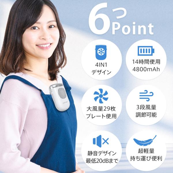 多機能扇風機 4800mAh 大容量 首掛け 腰掛け 手持ち 卓上 ハンズフリー 扇風機 14時間連続稼動可能 羽なし 軽量 携帯扇風機 充電式 3段階風量調節 静音 省エネ