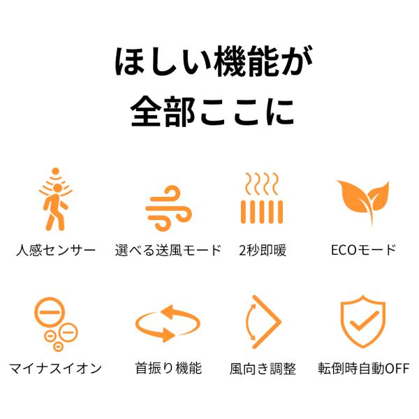 セラミックファンヒーター 2秒即暖 人感センサー付き 最大1500W 3種類送風モード 自動 首振り リモコン タイマー付き 転倒自動オフ 省エネ 静音 足元暖房