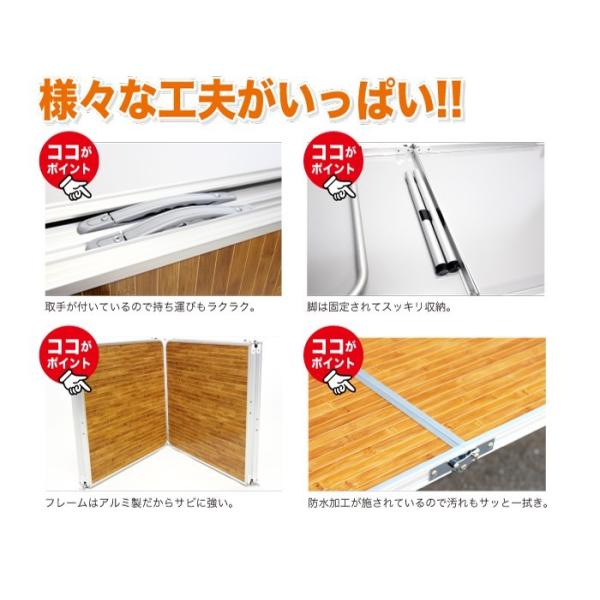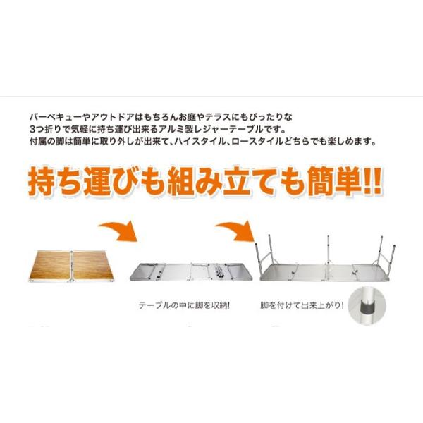軽量!キャンプ アルミ 4つ折りテーブル 高さ 2段階調節 240cm×60cm アウトドア 木目調 マルシェ 作業台 運動会 BBQ