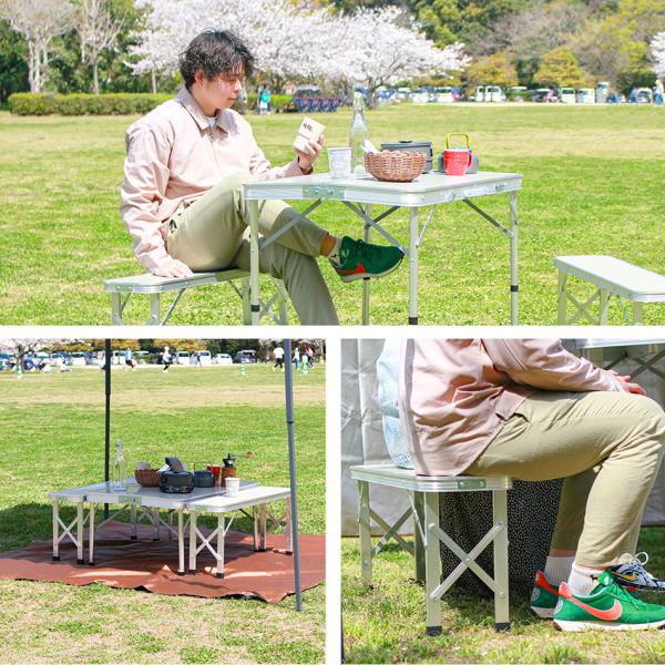 アウトドアテーブル アルミ レジャーテーブル 軽量折りたたみ 高さ調整 ベンチ セット パラソル穴付き 机 バーベキュー BBQ キャンプ 運動会 お花見