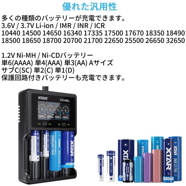 XTAR エクスター VC4SL リチウムイオン Ni-MH Ni-CD 充電器 エネループ 充電可能 高性能 Li-ion IMR INR ICR 4スロット 急速 高速 充電 USB タイプC