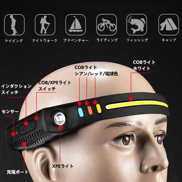 ヘッドライト センサー機能 9種点灯モード 充電式 LED 230°広角照明 集光・散光切替 SOS点滅 超軽量 usb 充電式 ヘッドライト