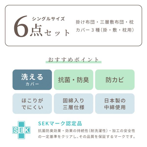 布団セット シングル 6点 テイジン 抗菌 防カビ 防ダニ 一式 まくら 枕 マクラ 敷き布団 掛け布団 カバー付き 綿 軽い おしゃれ 無地 シンプル 寝具 来客用