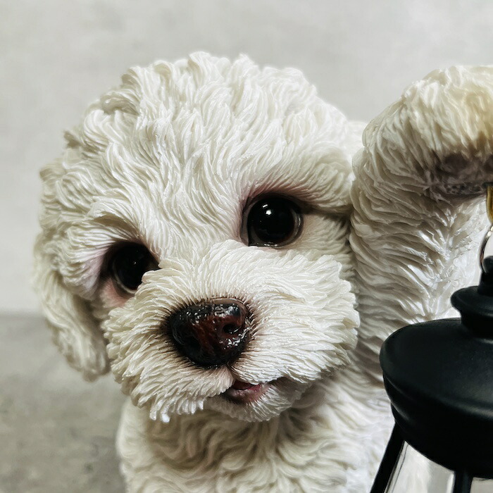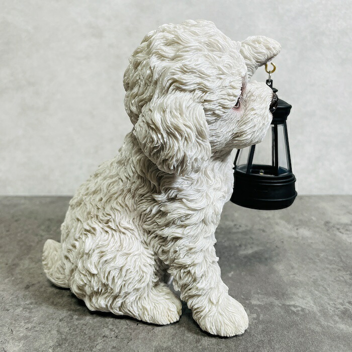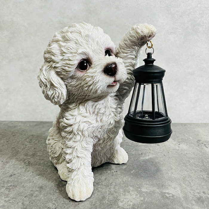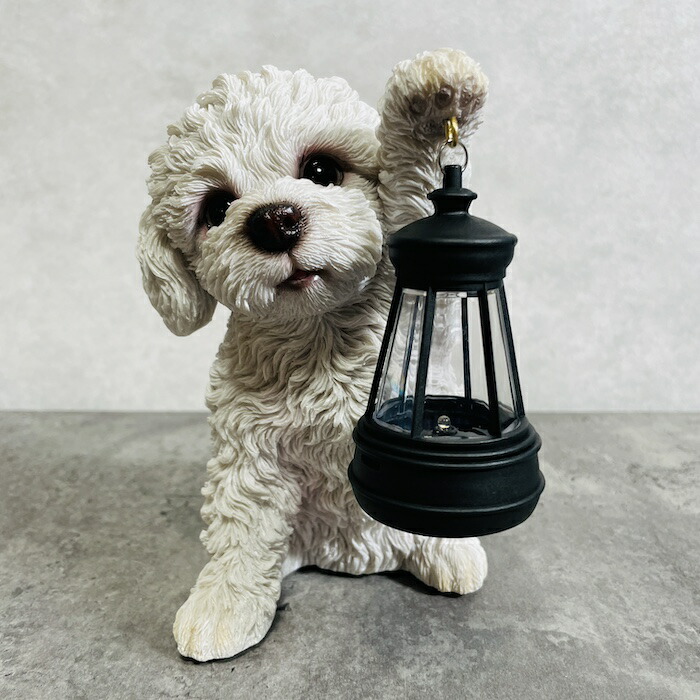 置物 犬 かわいい 動物 玄関 ソーラーランプを左手で持ち上げるトイプードル ホワイト おしゃれ ガーデン woobia ウービア