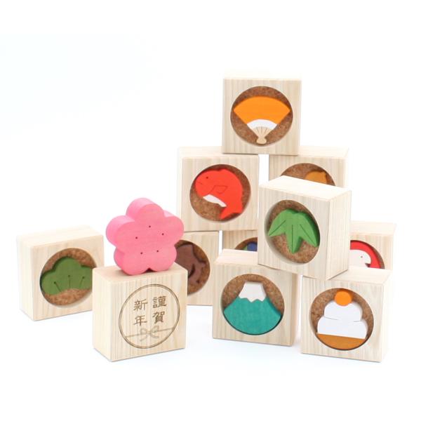 お正月ブロック 正月飾り 森林工芸館 縁起物 和風 新年 積み木 お正月置物 木製
