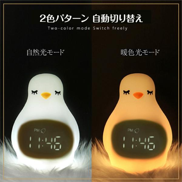 ペンギン 型 LED 目覚まし 時計 シリコン 柔らかい ぷにぷに 安全 調光 自然光 暖色光 鳥 バード コンパクト 軽量 卓上 スタンド アラーム 時刻 時間 かわいい