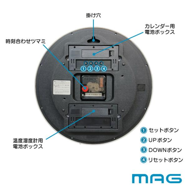 壁掛け時計 おしゃれ 湿度計付き MAG デジアナ ダブルポイント 掛け時計 カレンダー 日付表示 曜日 温湿度表示 温度計 アナログ デジタルクロック デジタル時計