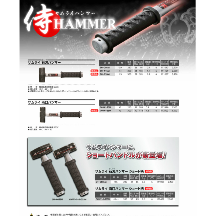 OH 侍 SAMURAI 石刃ハンマー ショートハンドル 0.6kg SH-06SSM 【サムライ 石頭 セットウ ハンマー オーエッチ工業】