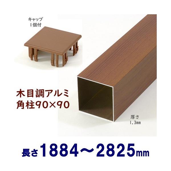 アルミ角柱 木目調 90角L2825mm 厚み1.3mm チーク キャップ1個付 支柱 角パイプ