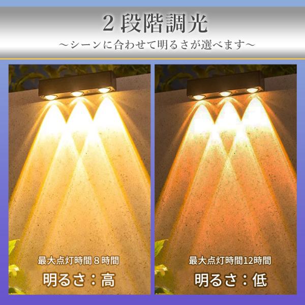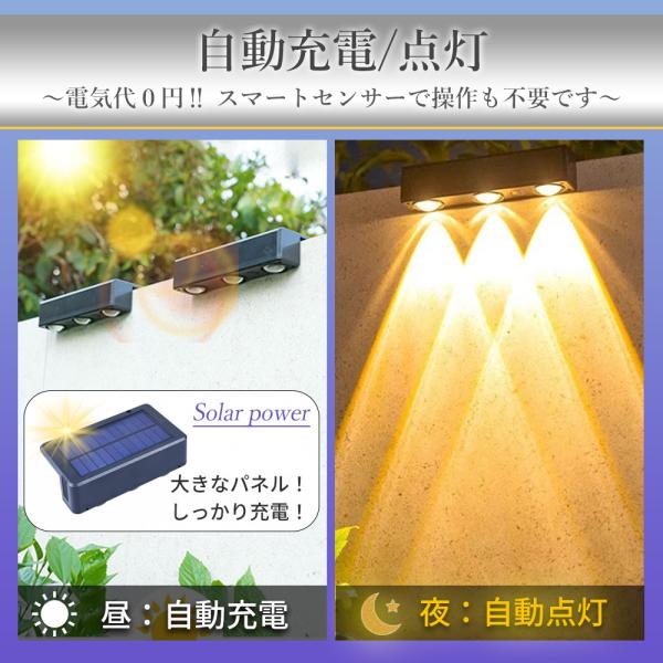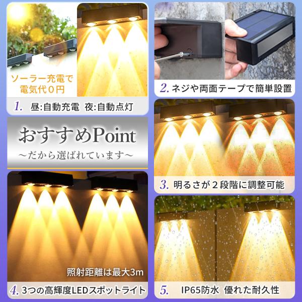 ソーラー充電ライト フェンスライト LED3灯 スポットライト 防水 暖色 明るさ2段階調整 自動点灯 太陽光充電 簡単設置 フェンス 玄関 屋外照明 防犯 防災 A196
