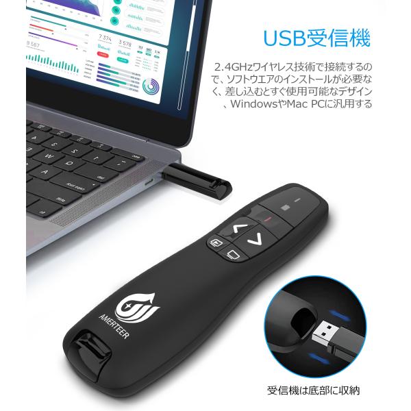 レーザーポインター ワイヤレス プレゼンター AMERTEER PPTスライド用リモート リモートコントロール PSC認証済み ブラック (RF015)