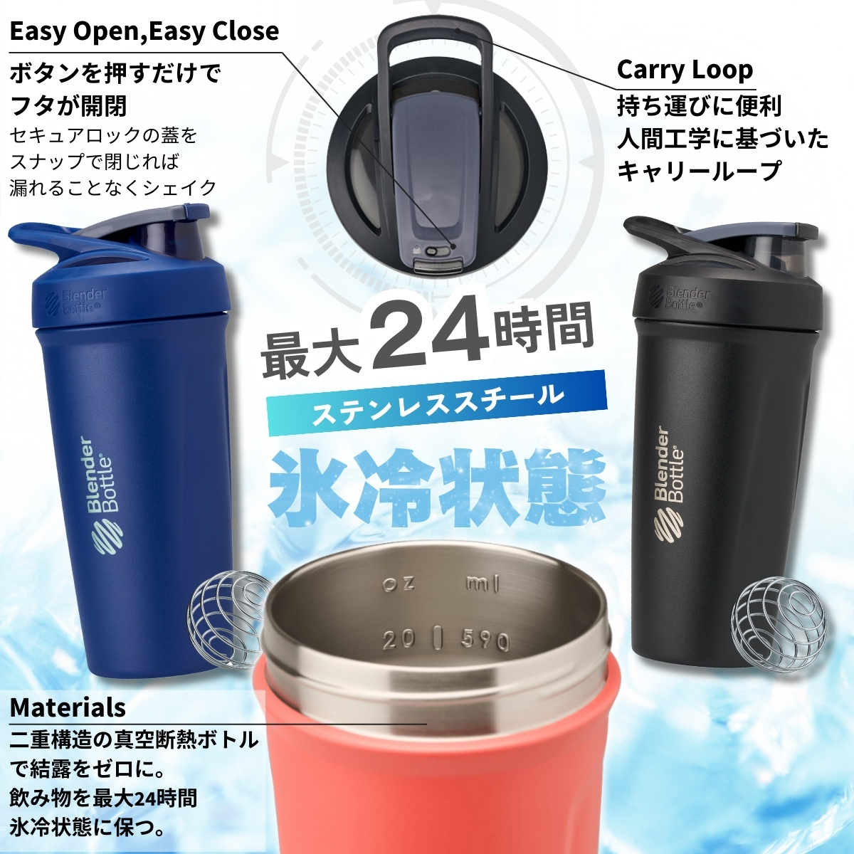 ブレンダーボトル ストラーダ 保冷 プロテインシェイカー おしゃれ ステンレススチール ボトル 24オンス 710ml 食洗機対応