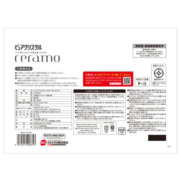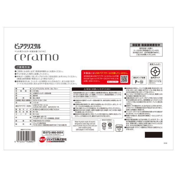 GEX ピュアクリスタル セラモ 1.8L ホワイト / ブルー 犬猫兼用 自動給水器 USB電源 フィルター式 循環式 給水器 シンプル おしゃれ ジェックス