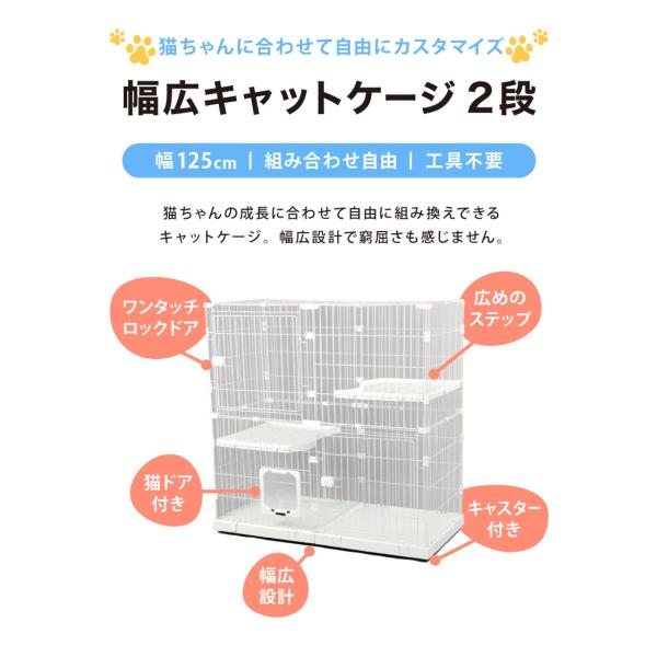キャットケージ 大型 組み合わせ自由 ホワイト 2段 幅125cm 幅広設計 キャスター付 シンプル おしゃれ キャットゲージ ハウス レビュー報告でボディタオル