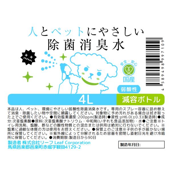 次亜塩素酸 人とペットにやさしい除菌消臭水 4L 減容ボトル 弱酸性 業務用