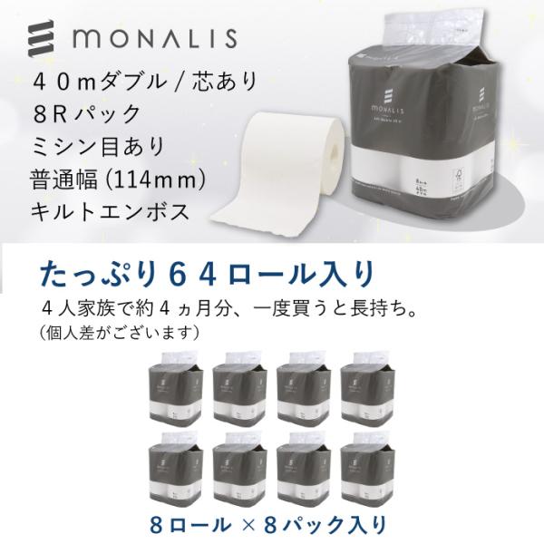 「ポイント最大17倍〜4/12」 トイレットペーパー ダブル 40m 8ロール 8パック 64ロール入 モナリス 業務用 芯あり 紙幅114mm ミシン目あり 10080010