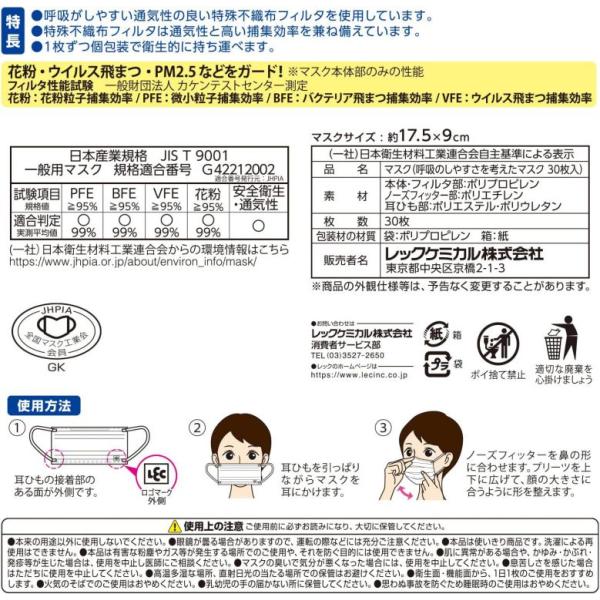 不織布マスク 個包装 呼吸のしやすさを考えたマスク ふつう 30枚入 ホワイト 白 普通 日本製 レック 【×4個セット】