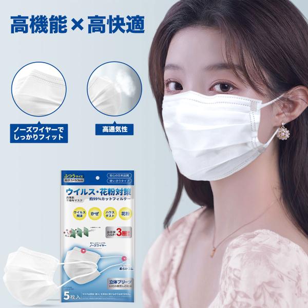 不織布 マスク 5枚入り 花粉 おとな メンズ レディース 不織布マスク BFE PFE VFE 99%以上CUT