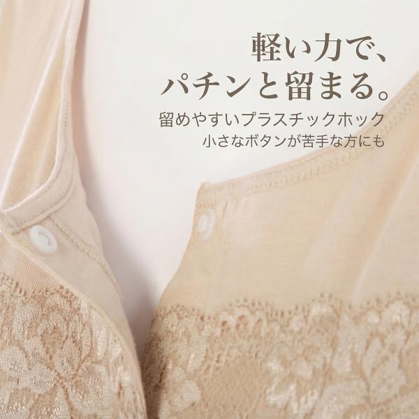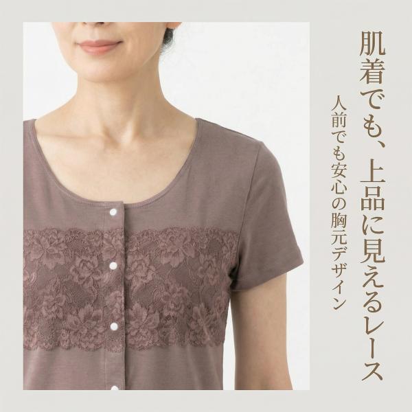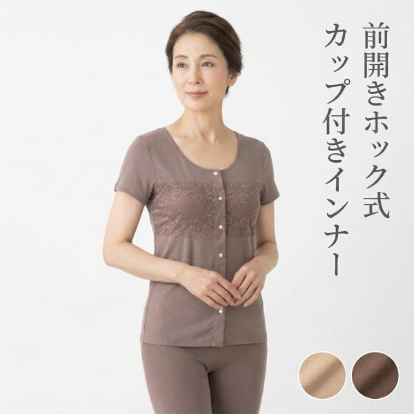 前開き 半袖 ホックインナー カップ付き 綿混 レース プラスチックホック 肌着 レディース S-LL ベージュ ブラウン