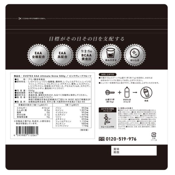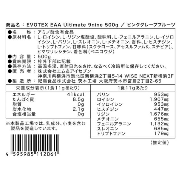 【EVOTEX EAA Ultimate 9nine】EAA パウダー ピンクグレープフルーツ味 500g 必須アミノ酸 9種類 BCAA 黄金比 国内製造 サプリメント 筋トレ サプリ 粉末