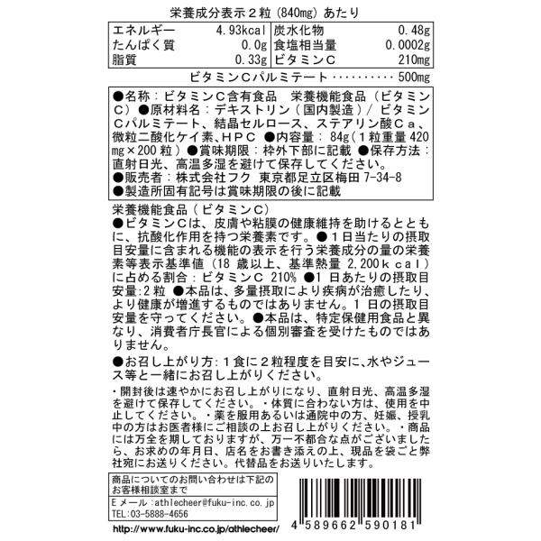 ビタミンC パルミテート 200粒入り 栄養機能食品 脂溶性 持続 サプリ アスリチア ATHLECHEER