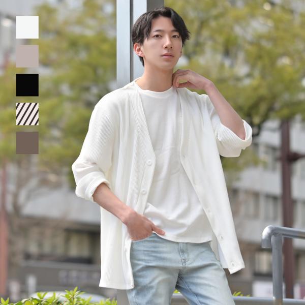サマーカーディガン メンズ ロングカーディガン ロング丈 薄手 長袖 春夏秋 ホワイト ベージュ ブラック ブラウン 白 黒 プリーツ ストレッチ M L XL
