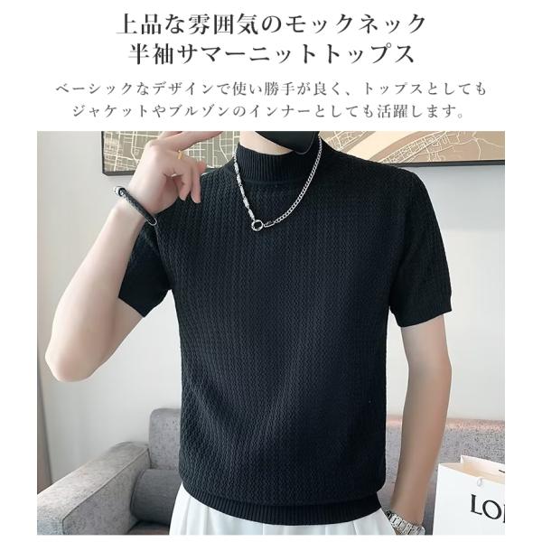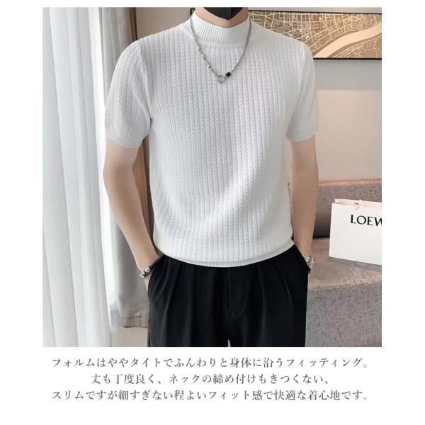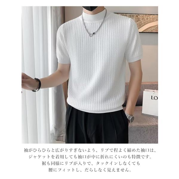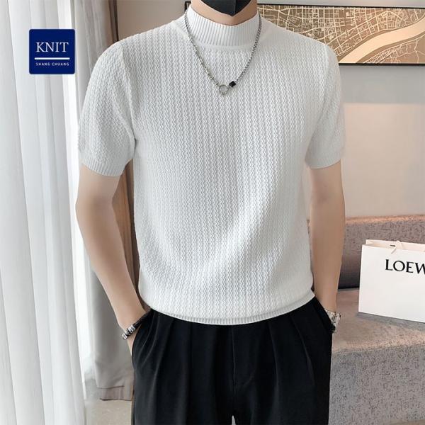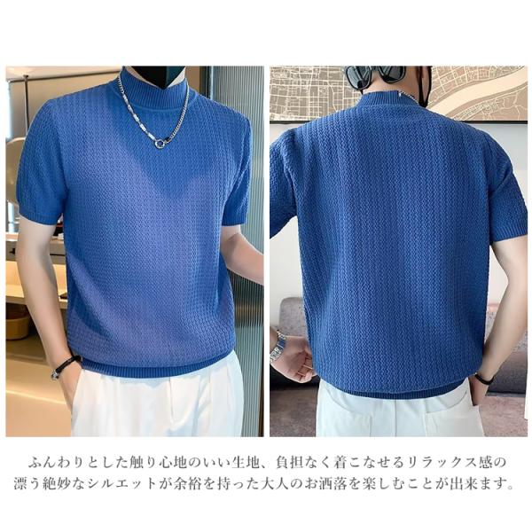 サマーニット メンズ 半袖 モックネック 無地 薄手 トップス デザイン 波編み Tシャツ ゴルフ シャツ キレイめ レイヤード 丸首 夏
