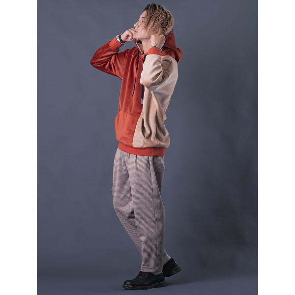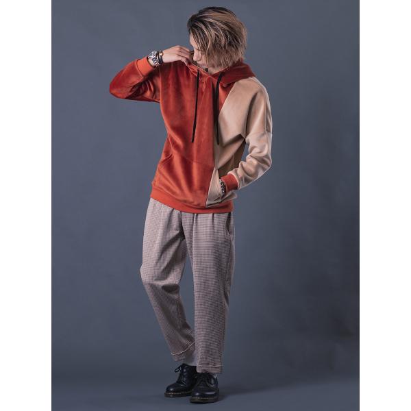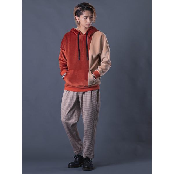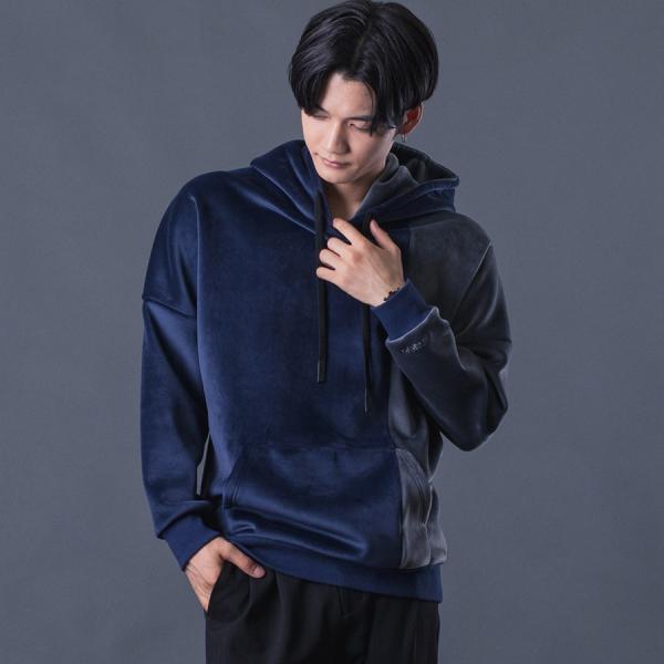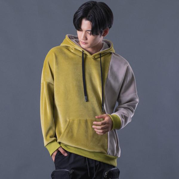 マイクロベロア配色パーカー メンズ ドロップショルダー プルオーバー バイカラー シンプル 無地 イエロー ブラウン ネイビー 黄 茶 紺 M L XL REGIEVO レジエボ