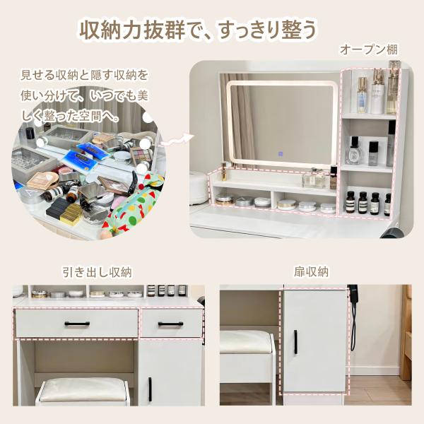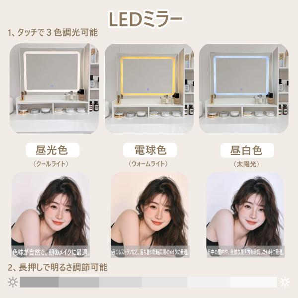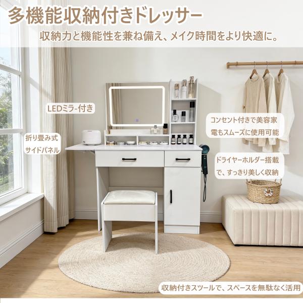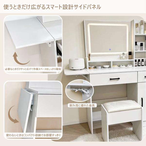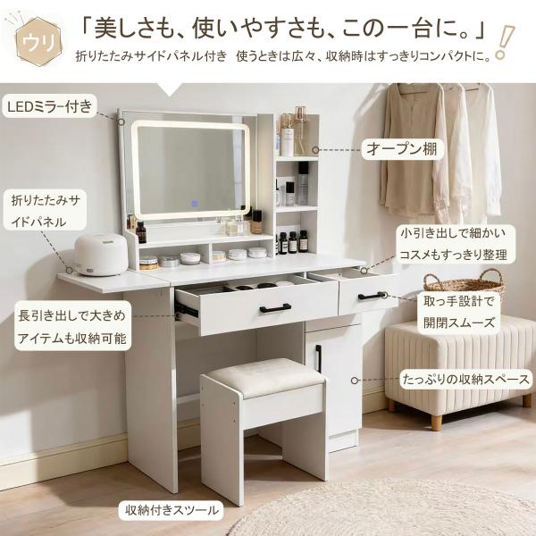 ドレッサー 折りたたみ式サイドテーブル コンパクトデザイン LED 補光ミラー付き 仕切り収納 ホワイト モダンシンプル 省スペース 一人暮らしアパート専用