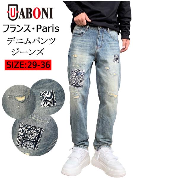 20%off デニムパンツ EU製 Uaboni Paris ユアボニ ソフト ヴィンテージ ダメージ ウォッシュ加工 高級刺繍 ICT オシャレ ボトムス ジーンズ ズボン