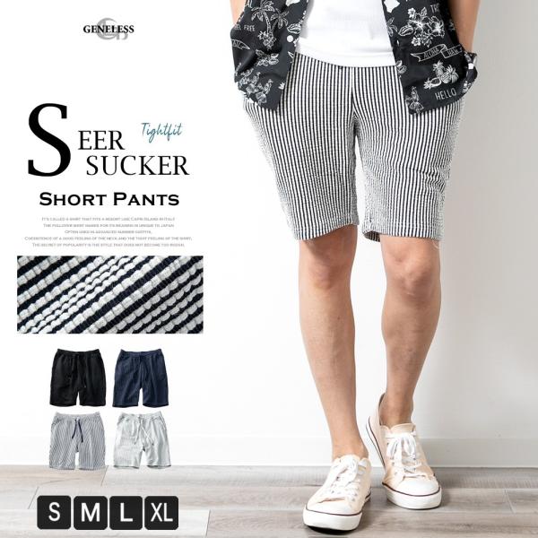 ハーフパンツ メンズ ストレッチ シアサッカー 膝丈 ショートパンツ 涼しい 短パン ゴムウエスト 夏 全4色 紺 ズボン ストライプ 黒 ネイビー