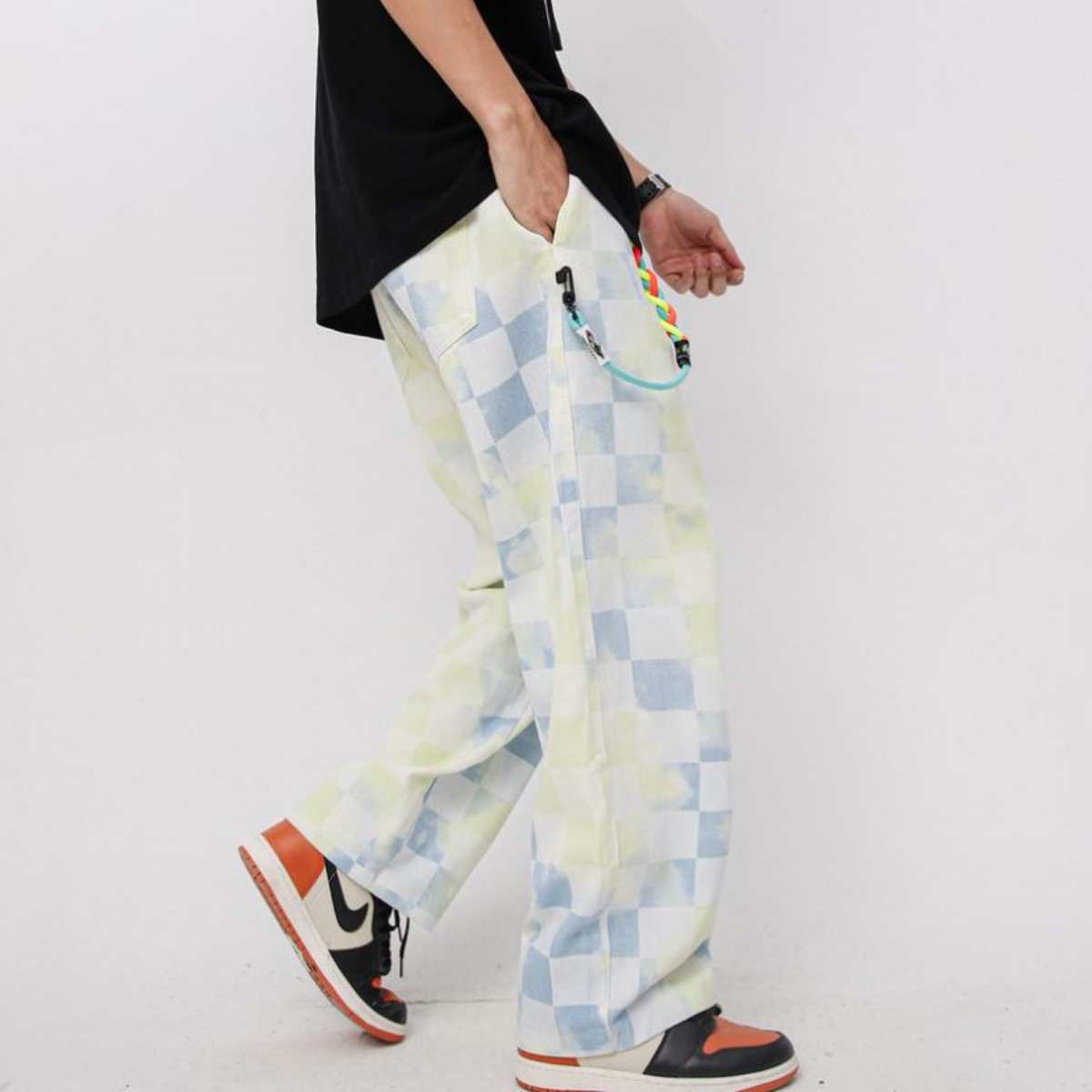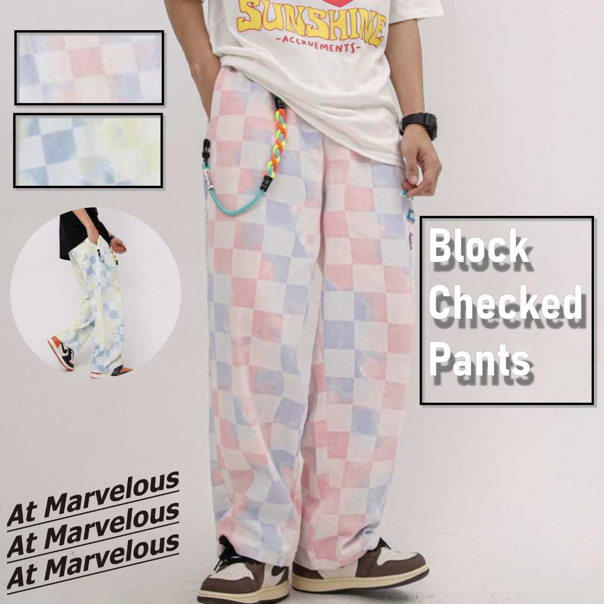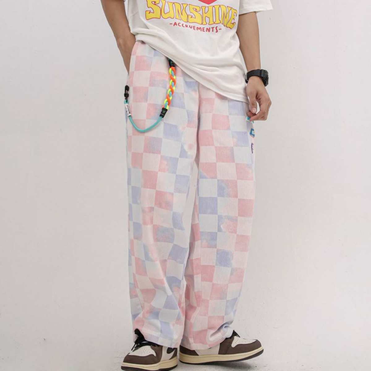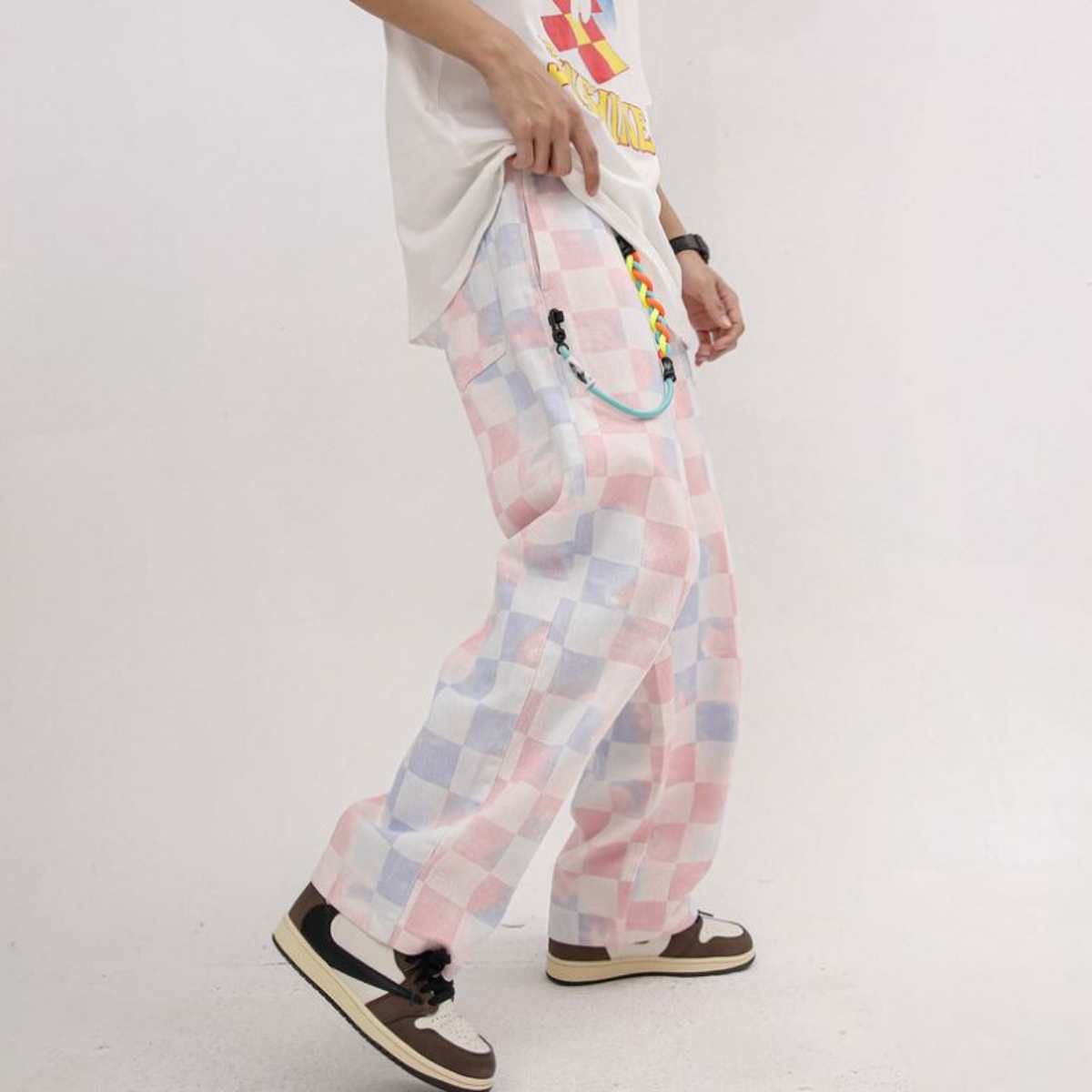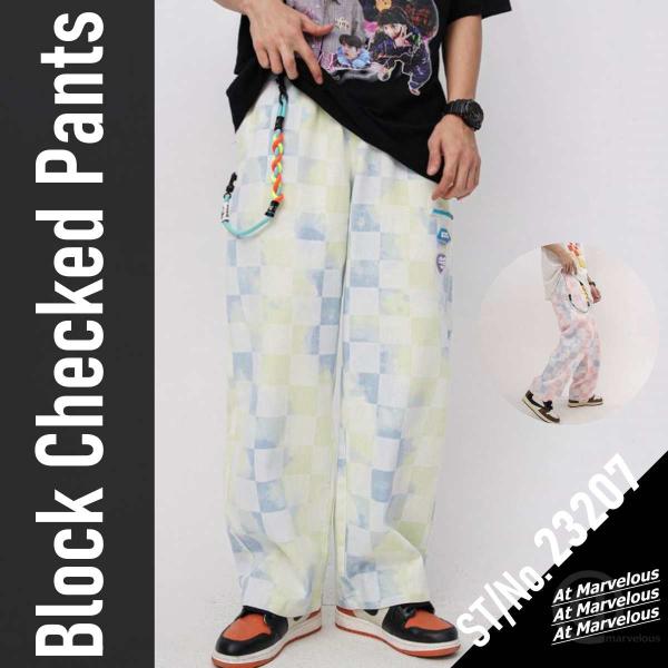 カラフルブロックチェックパンツ ウォレットチェーン ストリート メンズ かっこいい ボトムス ズボン ウエストゴム ゆったり