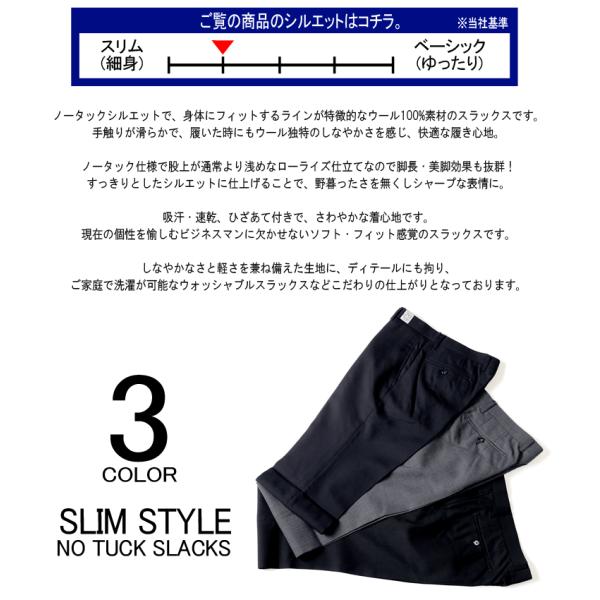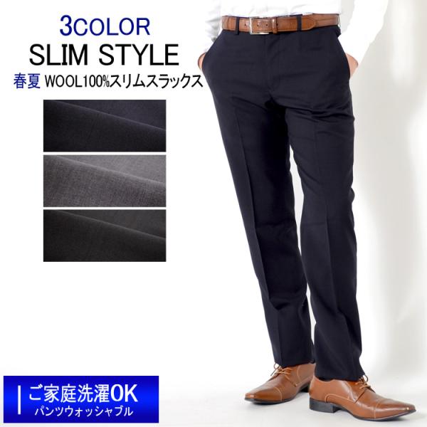 スラックス 春夏ノータックスラックス WOO100% ウール100% ご家庭で洗える スリムモデル 3color 無地 ビジネススラックス COOLBIZ
