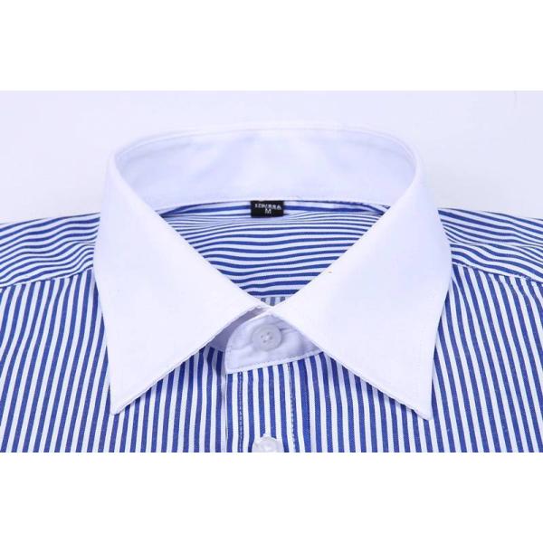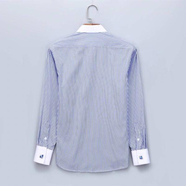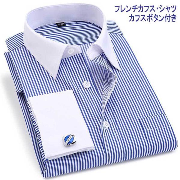 ドレスシャツ メンズ フレンチカフス ワイシャツ 長袖 胸ポケット ノーマルシルエット ネイビー ストライプ ヒッコリーストライプ カフス付き